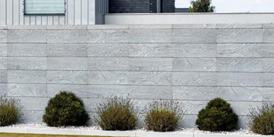 Charakterystyczna struktura kamienia łupanego. Szybki montaż, wyrazista estetyka i wieloletnia trwałość betonowych pustaków.