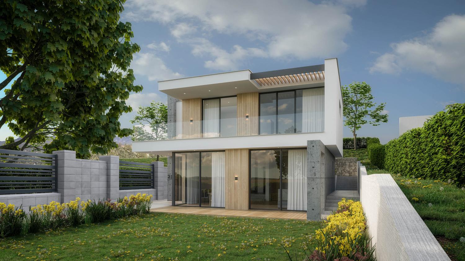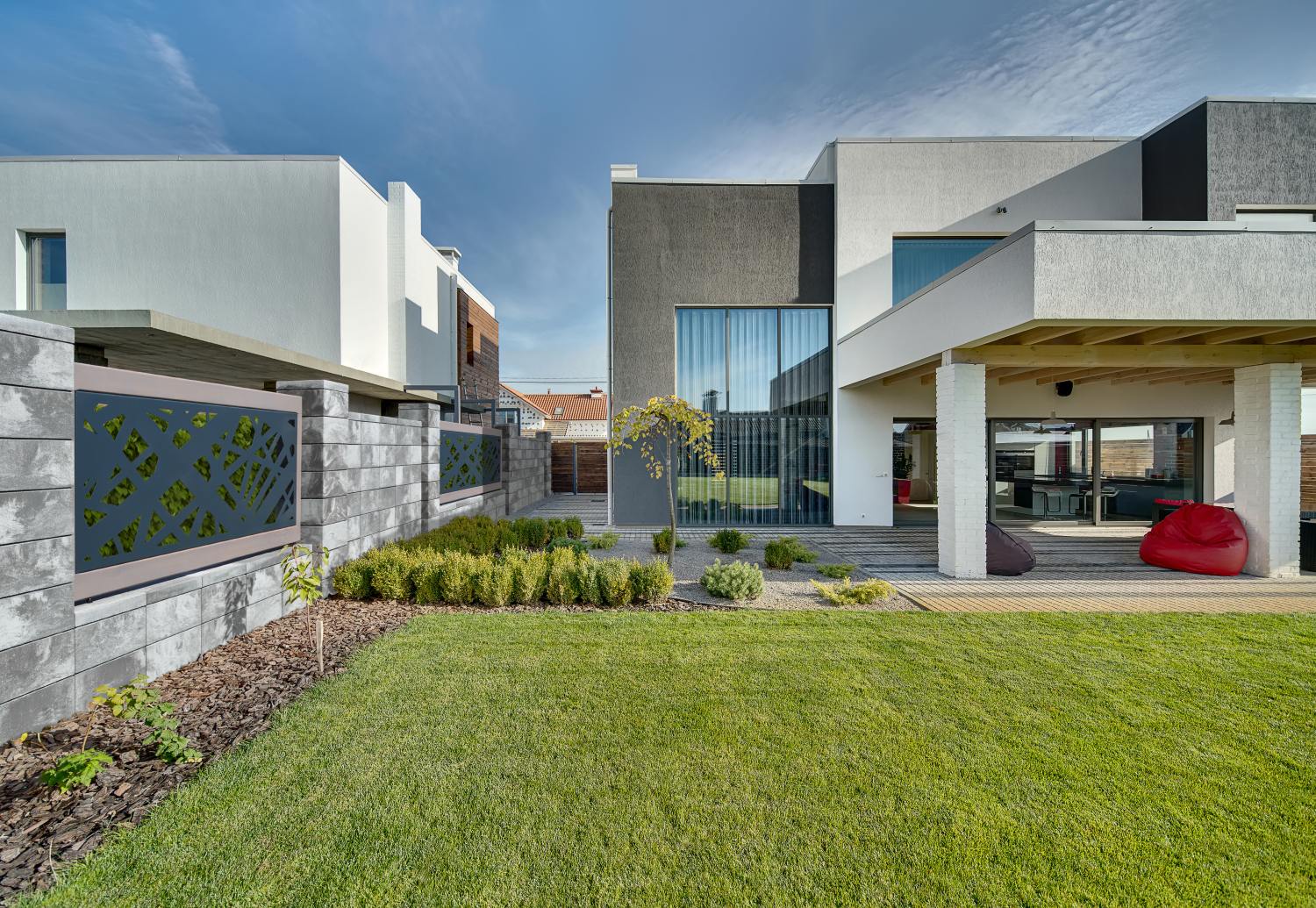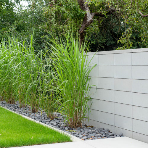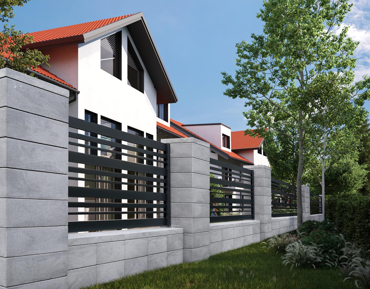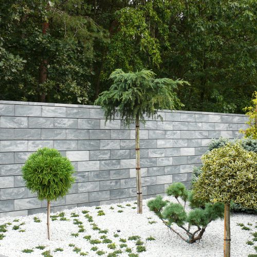 Nowoczesny system ogrodzeniowy, który charakteryzuje się prostymi kształtami. Delikatna linia fug podkreśla geometryczny charakter całości.
